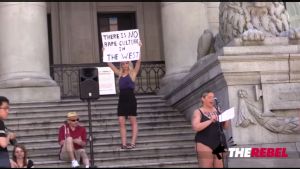 She defends making rape jokes. Jokes are cultural, ergo rape jokes are quite literally "rape culture." She is herself the very definition of the thing she claims does not exist. She didn't, as far as I can tell (I'm not willing to sit through her entire incoherent rant) show footage of her sign being torn up, so it's reasonable to conclude she's lying about that. She was interfering with a legitimate event, on private property, and received no more than a calm dressing down for her inappropriate behaviour. Seems the slut walk is an exceedingly safe space, even for assholes. |