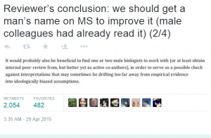 quote [ In [a] woefully ironic turn of events, the reviewer of a rejected, solely female-authored manuscript examining gender bias in academia recommended that the scientists add in a couple of men to their team to make their research more scientifically robust. ]